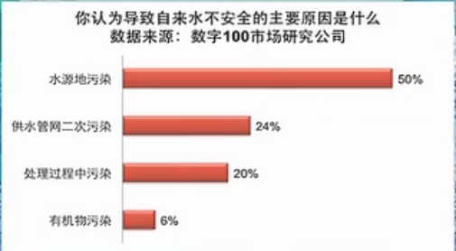 根據(jù)一項調查自來水主要污染的問題是什么?其中水源地污染占50%,供水管網(wǎng)二次污染和處理中的污染占44%。