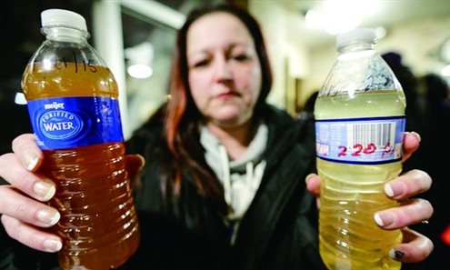 弗林特水危機期間一名市民展示受嚴重污染的飲用水