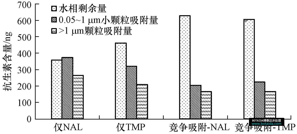 圖 3所示為萘啶酸(NAL)與甲氧芐啶(TMP)單獨(dú)存在及共同存在于水中的吸附實(shí)驗(yàn)結(jié)果.對(duì)比兩種條件下抗生素的水相剩余量可知,競(jìng)爭(zhēng)吸附達(dá)到平衡時(shí),甲氧芐啶、萘啶酸的水相剩余量均有所增加.所以,二者在吸附過程中是相互抑制的,且甲氧芐啶對(duì)萘啶酸的抑制作用更強(qiáng).這可能是因?yàn)榧籽跗S啶中含有—NH2,而萘啶酸中含有—COOH,二者發(fā)生反應(yīng),相互作用后減少了吸附位點(diǎn),從而降低了顆粒對(duì)二者的吸附.競(jìng)爭(zhēng)吸附時(shí),固體顆粒對(duì)抗生素的吸附總量增長(zhǎng)了19.69%,明顯小于抗生素的增長(zhǎng)量.
