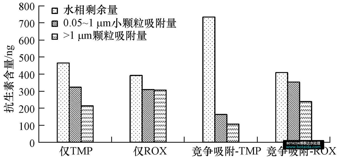 圖 4所示為甲氧芐啶(TMP)與羅紅霉素(ROX)單獨(dú)存在及共同存在于水中的吸附實(shí)驗(yàn)結(jié)果.從水相剩余量角度來看,甲氧芐啶的水相剩余量大幅增加,而羅紅霉素的水相剩余量幾乎未發(fā)生變化.受羅紅霉素影響,甲氧芐啶在固液間的Kd值變小.從結(jié)構(gòu)上看,羅紅霉素屬于大環(huán)內(nèi)酯類抗生素,單位質(zhì)量的活性基團(tuán)—OH、—C O較少,吸附能力較弱;而甲氧芐啶只含苯胺基和酰胺基兩個(gè)離子型官能團(tuán),在顆粒上的吸附作用也較弱.但是,羅紅霉素的分子量較大,單個(gè)分子上的活性基團(tuán)較多,能占據(jù)更多的吸附位點(diǎn),所以,顆粒對(duì)甲氧芐啶的吸附就相應(yīng)地受到了抑制.