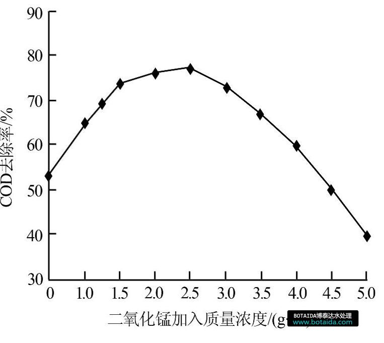 在pH=3.0,鐵炭總質(zhì)量濃度20 g/L,鐵炭比3∶1,反應(yīng)時間40 min,H2O2投加質(zhì)量濃度為0.55 g/L條件下,分別加入0、1.00、1.25、1.50、2.00、2.50、3.00、3.50、4.00、4.50、5.00 g/L的MnO2,考察二氧化錳對微電解處理廢水體系的催化作用,結(jié)果如圖2所示。