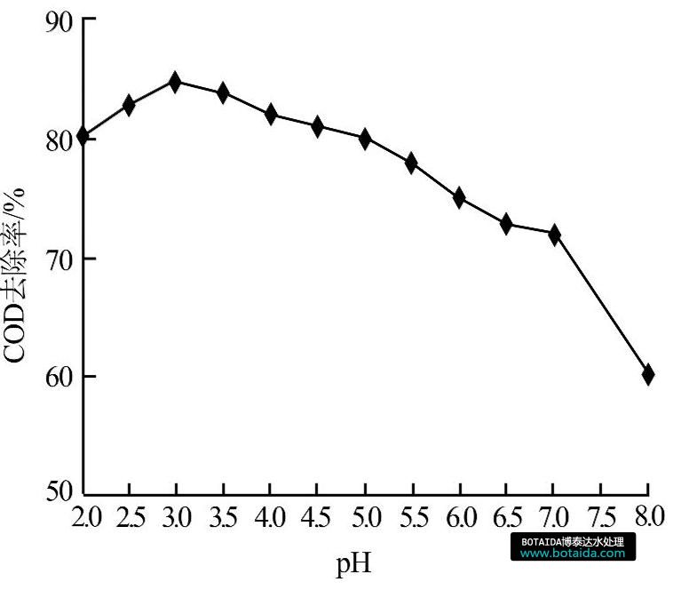 由圖4可以看出,在酸性條件下,隨pH的增加,廢水COD去除率增加,在pH=3.0時有最佳效果。當(dāng)pH小于3.0時,鐵屑與酸反應(yīng)生成的氫氣大量覆蓋在鐵屑的表面,減小了鐵屑的有效表面積,降低了原電池效應(yīng),從而使處理效果下降。而且溶液pH過低,會破壞絮凝體,使溶液因Fe2++和Fe3++濃度增大而色度增加。當(dāng)pH大于3.0時,H+濃度逐漸降低,陰極的反應(yīng)效果也下降。所以選擇適宜的進(jìn)水pH為3.0。