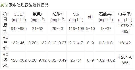 脫脂廢水、磷化廢水、噴漆廢水和電泳廢水等機械加工廢水的有機物濃度較高,且含有礦物油、懸浮物和氮磷等污染物。通過氣浮和混凝沉淀處理可將COD降低到700 mg/L左右,生物系統(tǒng)(缺氧和好氧工藝)可將COD降低到70 mg/L左右,出水可穩(wěn)定達標排放。實際運行時首先投加NaOH將廢水pH調至8.5~9.0,然后按照3、5、1.0 mL/L的投加量分別加入5%(質量分數,下同)的CaCl2溶液、10%的聚合氯化鋁和5%的聚丙烯酰胺溶液,混合反應60 min后進入氣浮池,氣浮出水按6、1.5 mL/L投加量分別投加10%的聚合氯化鋁和5%的聚丙烯酰胺溶液,混凝沉淀出水最后進入生物處理系統(tǒng),生化出水經砂濾器、炭濾器、超濾、保安過濾器和反滲透深度處理后回用于生產,反滲透濃水可達到GB 8978—1996三級標準。該工程已穩(wěn)定運行4 a多,從實際檢測結果來看,反滲透產水COD穩(wěn)定在32~45 mg/L,電導率穩(wěn)定在18~42 μS/cm,可滿足生產用水水質要求;反滲透濃水COD穩(wěn)定在128~302 mg/L,SS穩(wěn)定在26~51 mg/L,達到GB 8978—1996三級標準后達標排放,其主要水質指標如表 2所示。