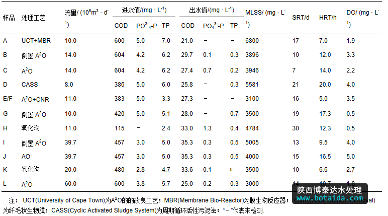 實(shí)驗(yàn)所用的污泥樣品分別采集于9個污水處理廠,其中有2個水廠各包含2個工藝,共11個工藝.每個工藝取1個污泥樣品.其中,針對A2O+纖毛狀生物膜(CNR)工藝取2個樣品,分別位于加膜區(qū)和無膜區(qū),是為了考察加膜對聚磷菌的菌群結(jié)構(gòu)是否有影響,因此,共有12個樣品.12個樣品依次命名為A、B、C、D、E、F、G、H、I、J、K和L.其中,B和C取自同一水廠,I和J取自同一水廠,E和F取自A2O+纖毛狀生物膜工藝的加膜區(qū)和無膜區(qū).污水處理廠的運(yùn)行參數(shù)及進(jìn)出水指標(biāo)見表 1.