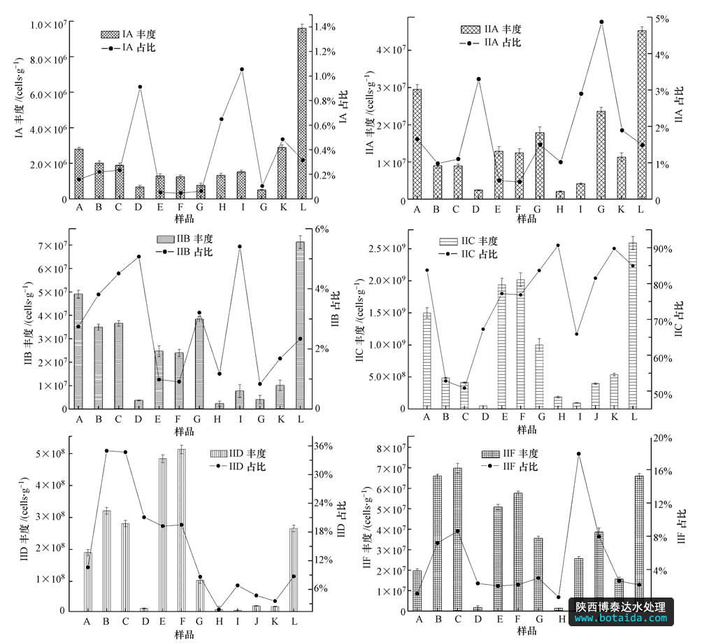 采用實(shí)時定量PCR定量分析Accumulibacter(I、IIA、IIB、IIC、IID、IIF)6個分支的豐度,結(jié)果如圖 1所示.Accumulibacter 6個分支均為單拷貝基因,即Accumulibacter的細(xì)胞數(shù)為ppk1基因的拷貝數(shù).總Accumulibacter的定量變化范圍為7.32×107(D)~3.05×109 cells · g-1(L),平均為1.20×109 cells · g-1(以MLSS計).在12個樣品中,只有D樣品數(shù)量級為107,比其他樣品低1~2個數(shù)量級,其中的Accumulibacter ppk1基因含量偏低;有6個樣品數(shù)量級為108,分別為H、B、C、I、J和K;樣品A、E、G、F和L的數(shù)量級為109,這5個樣品中的Accumulibacter的ppk1基因含量高于其他樣品,其中樣品L(A2O工藝)含量最高,達(dá)到了3.05×109 cells · g-1(以MLSS計).12個樣品中Accumulibacter占總菌的百分比變化范圍為0.58%~ 22.77%,平均為9.17%(圖 1).