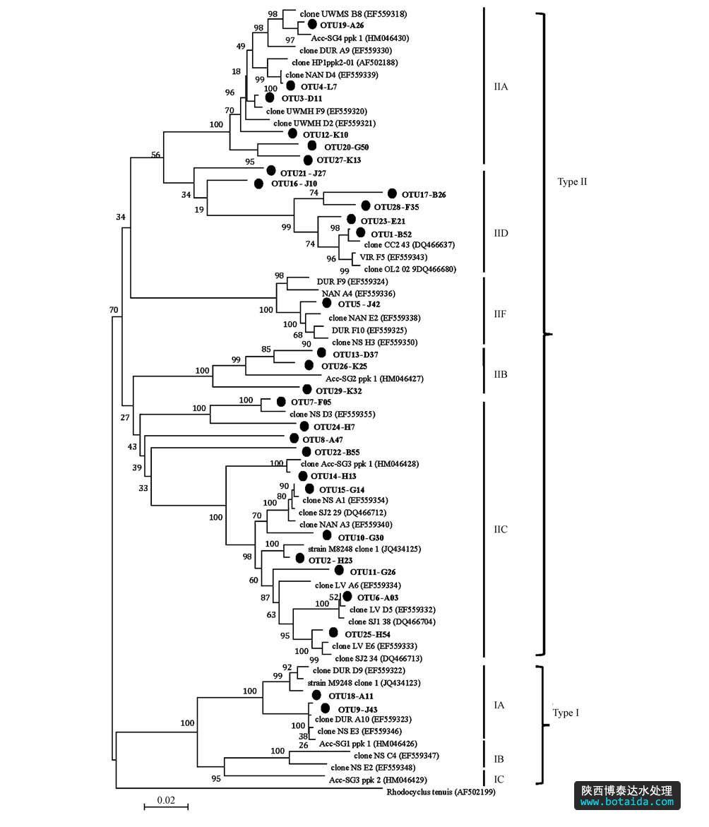 結(jié)合圖 4和圖 5可知,IIA包含6個OTUs(88條序列),IIB包含3個OTUs(6條序列),IIC包含11個OTUs(124條序列),IID包含4個OTUs(315條序列),IIF包含1個OTU(共23條序列).其中,優(yōu)勢OTUs(OTU1~OTU3)分別隸屬于IID、IIC、IIA.QPCR和PCR-Cloning-Sequencing的研究結(jié)果都證實(shí)了12種污水處理工藝中Type I豐度很低,主要以 Type II為主,且IIA、IIC、IID是系統(tǒng)中的優(yōu)勢分支.