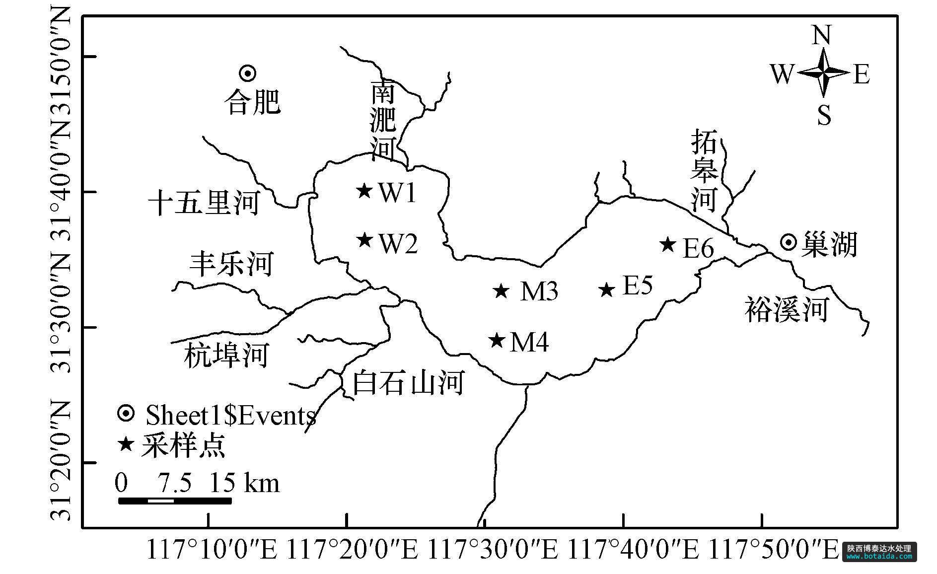 巢湖(31°25′~31°43′ N,117°16′~117°50′ E)位于安徽省中部,江淮丘陵之間,湖岸線總長(zhǎng)184.7 km,東西長(zhǎng)61.7 km,南北寬20.8 km,最大水深3.77 m,平均水深2.69 m,現(xiàn)有水域面積大約為770 km2,蓄水量20.7×108 m3(王蘇民等,1998).流域總面積達(dá)16659 km2,以巢湖與裕溪河之間的閘門分為兩個(gè)部分(余秀娟,2012),屬亞熱帶與暖溫帶過渡性的副熱帶季風(fēng)氣候區(qū),氣候溫和濕潤(rùn),年平均溫度在15~16 ℃之間,多年平均降水量為1000~1158 mm.流域內(nèi)地形地貌西高東低、中間低洼平坦(顧成軍等,2005).流域內(nèi)共有河流33條,分別屬于南淝河-店埠河、杭埠河-豐樂河、白石山河、柘皋河、派河、裕溪河等7條水系,從南、西、北呈放射狀直接或間接匯入巢湖,再由裕溪河注入長(zhǎng)江(高超等,2009).1962年建成巢湖閘控制水位后,基本上切斷了巢湖與長(zhǎng)江在自然狀態(tài)下的水量交換,巢湖由自然狀態(tài)下的過流性湖泊,成為半吞吐型過水湖泊.由于入湖河流上游坡陡流急,挾帶大量泥沙匯入湖內(nèi)沉積,多年來,巢湖因流域河流輸沙影響而導(dǎo)致淤積嚴(yán)重(閻伍玖等,1998).