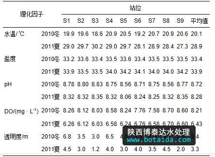 水溫、鹽度、電導(dǎo)率、溶解氧(DO)、pH值等理化因子通過(guò)采用美國(guó)YSI-561多參數(shù)水質(zhì)分析儀進(jìn)行現(xiàn)場(chǎng)測(cè)定,透明度用薩氏盤(pán)測(cè)定.