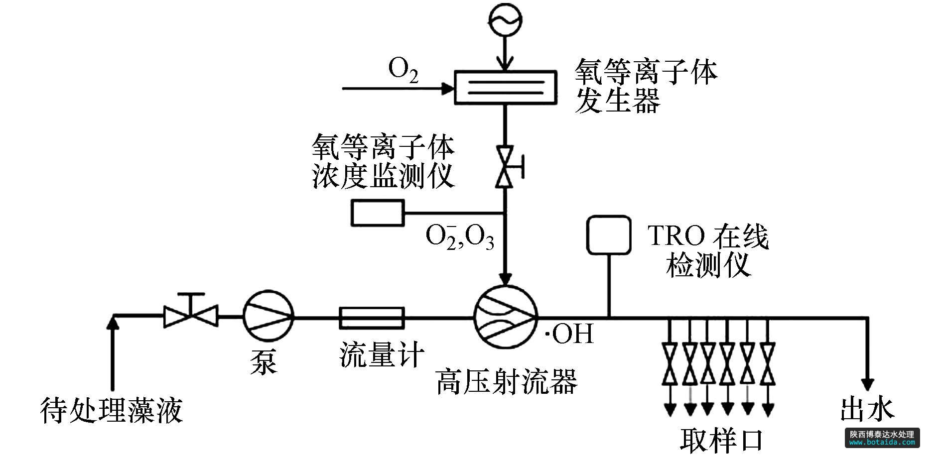 O2· -、HO3 ·和O2+H2O等自由基,將這些氧自由基統(tǒng)稱為總氧化劑TRO,使用在線檢測儀(ATi Q45H,美國)對管路中的TRO濃度進行測定.TRO溶液在管路中作用于藻細胞,進行快速高效地殺滅.管路中設(shè)置不同的取樣點,作用時間分別為1、2、3、4、5、6 s,以研究不同作用時間的殺滅效果.