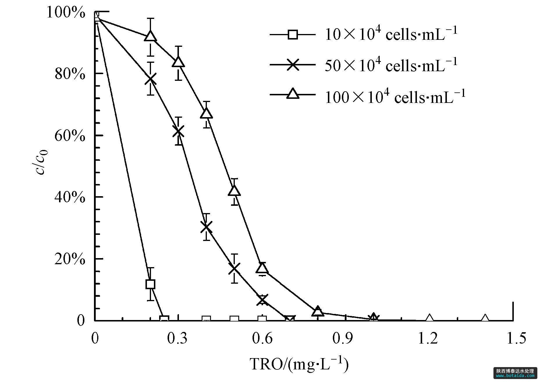 實驗中對初始藻密度分別為10×104、50×104、100×104 cells · mL-1的藻液在實驗系統(tǒng)中進行殺滅.對于某一藻密度的藻液,改變TRO濃度,利用熒光顯微鏡測定藻細胞的存活率(c/c0).得到不同初始藻密度的藻細胞存活率與TRO濃度的關(guān)系曲線,如圖 3所示.可看出,隨著TRO濃度的不斷升高,藻細胞存活率隨之降低;在相同的TRO濃度下,藻類的初始濃度越高,存活率越低.因此使不同的初始藻密度的藻細胞完全致死所需的TRO濃度是不同的.隨著藻液初始藻密度的升高,所需要的致死劑量也隨之升高.致死劑量由低到高分別為0.25、0.71、1.18 mg · L-1.