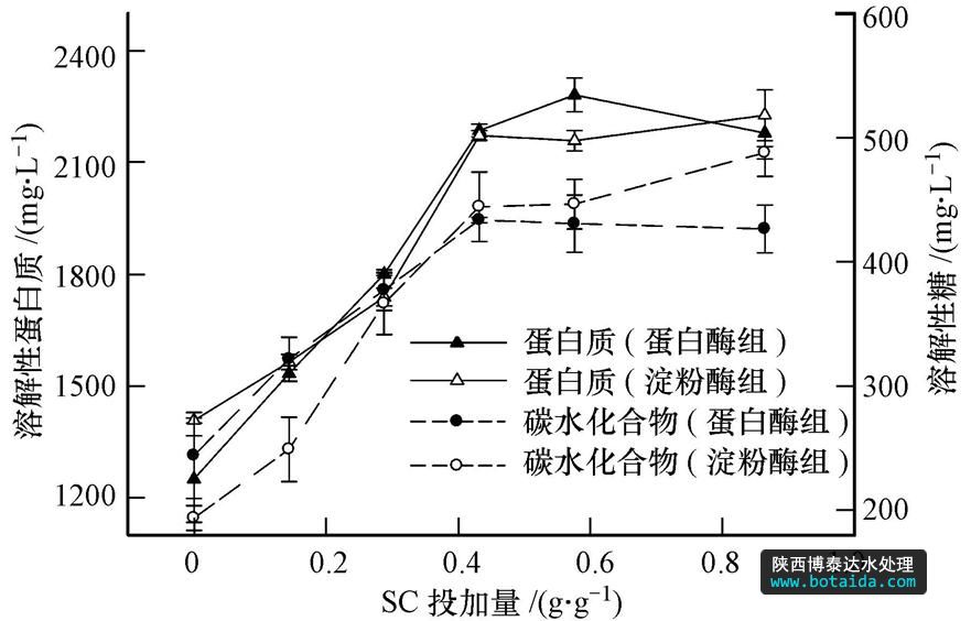原污泥中的溶解性蛋白質(zhì)和碳水化合物濃度較低(溶解性蛋白質(zhì)73.0 mg · L-1,溶解性碳水化合物14.2 mg · L-1),表明其中的有機物主要以固體狀態(tài)存在,溶解性有機質(zhì)的含量較低.空白對照組(不加酶也不加SC)反應4 h后,污泥中的溶解性蛋白質(zhì)和碳水化合物濃度分別增加至400.0和79.0 mg · L-1.在水解酶的作用下,隨著污泥膠團的解聚和胞外聚合物的水解,大量有機質(zhì)由固相轉(zhuǎn)移至液相,成為溶解性物質(zhì).圖 1為蛋白酶和淀粉酶組實驗(均投加酶0.06 g · g-1)在不同SC投加量下(0、0.144、0.288、0.432、0.576、0.864 g · g-1),反應4 h后污泥中蛋白質(zhì)和碳水化合物濃度隨SC投加量的變化情況.由圖可知,只投加水解酶(不投加SC)時,溶解性蛋白質(zhì)由原污泥的73.0 mg · L-1分別增加至1250.0 mg · L-1(蛋白酶組)和1407.0 mg · L-1(淀粉酶組),溶解性碳水化合物由原來的14.2 mg · L-1分別增加至244.0 mg · L-1(蛋白酶組)和194.0 mg · L-1(淀粉酶組).污泥的主要成分是蛋白質(zhì),此研究中淀粉酶和蛋白酶促進污泥水解的效果差不多,其原因如下:一方面,Pinnekamp(1989)指出,碳水化合物和蛋白質(zhì)的可生物降解率分別為52.24%和39.70%,蛋白質(zhì)的可生物降解性較差,其水解在污泥水解過程中是限速步驟.在較短的時間內(nèi),碳水化合物的水解效率高于蛋白質(zhì).另一方面,EPS中碳水化合物可能與蛋白質(zhì)相結(jié)合,從而形成碳水化合物-碳水化合物、碳水化合物-蛋白質(zhì)、蛋白質(zhì)-蛋白質(zhì)相結(jié)合的結(jié)構(gòu),破壞其中任何一種物質(zhì),與其相結(jié)合的另一物質(zhì)也會隨之溶解出來(Sesay et al., .,2006).