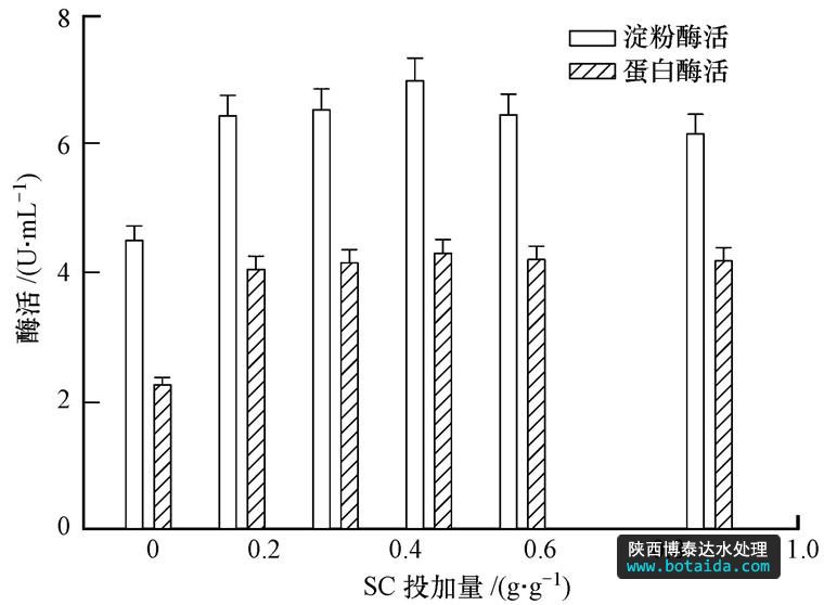 SC對污泥酶水解影響:設(shè)立2批次實驗(每批次包括6個實驗組),各批次均取400 mL污泥,分別投加蛋白酶、淀粉酶0.06 g · g-1(以TS 計,下同),SC以粉末形式投加,SC的投加量分別為0、0.144、0.288、0.432、0.576、0.864 g · g-1,隨后向各錐形瓶中通入氮氣約4 min以完全驅(qū)除殘留空氣,加塞置于50℃水浴振蕩器上反應,4 h后取樣測定水解產(chǎn)物及蛋白酶和淀粉酶的活性,并進行分析.同時設(shè)定空白對照組,除不加酶和SC外,其它條件與實驗組均相同.