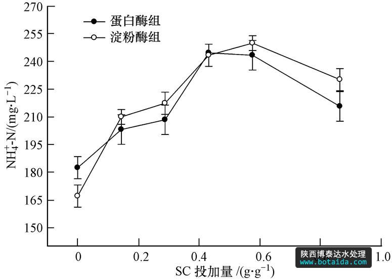 圖 3為反應4 h后,污泥中氨氮濃度隨SC投加量的變化情況.在水解酶的催化作用下,污泥中的含氮物質(zhì)——主要為蛋白質(zhì)轉(zhuǎn)化為二肽、氨基酸,氨基酸進一步轉(zhuǎn)化為氨(Shanableh et al., .,2001).因此,蛋白質(zhì)不斷溶出的同時,污泥液相中的氨氮濃度也不斷提高.只投加水解酶(不投加SC)時,氨氮濃度由原污泥的60.0 mg · L-1分別增加至182.0 mg · L-1(蛋白酶組)和167.0 mg · L-1(淀粉酶組).當SC投加量為0.432 g · g-1時,氨氮濃度分別增加至245.0 mg · L-1(蛋白酶組)和243.0 mg · L-1(淀粉酶組).蛋白質(zhì)和碳水化合物是剩余污泥的主要組成成分,脂肪含量很少,基本可以忽略.蛋白質(zhì)的可生化降解性較差,其水解在污泥消化過程中是限速步驟,決定了此過程中有機物的降解程度(劉常青等,2008).SC的投加提高了蛋白質(zhì)的降解速率,一方面是由于SC的投加促使更多的蛋白質(zhì)溶解到液相,其降解速率高于固相中的蛋白質(zhì).另一方面,SC的投加破壞了EPS的網(wǎng)絡(luò)結(jié)構(gòu),水解酶得到釋放,從而增加了其與底物的接觸機會,蛋白質(zhì)的轉(zhuǎn)化效率得到提高.