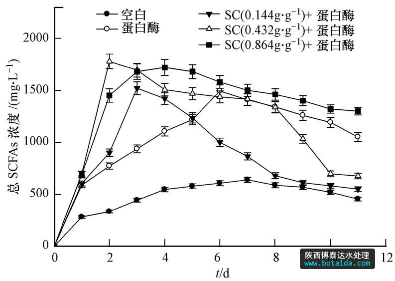SC對污泥產(chǎn)酸影響:設(shè)立4組實驗,各組均取400 mL污泥,先投加蛋白酶0.06 g · g-1,SC以粉末形式投加,每組SC的投加量分別為0、0.144、0.432、0.864 g · g-1,隨后向各錐形瓶中通入氮氣約4 min以完全驅(qū)除殘留空氣,加塞置于50℃水浴振蕩器上反應,反應裝置在此條件下反應12 d,每天對酸化產(chǎn)物SCFAs進行測定.同時設(shè)定空白對照組,除不加酶和SC外,其它條件與實驗組均相同.