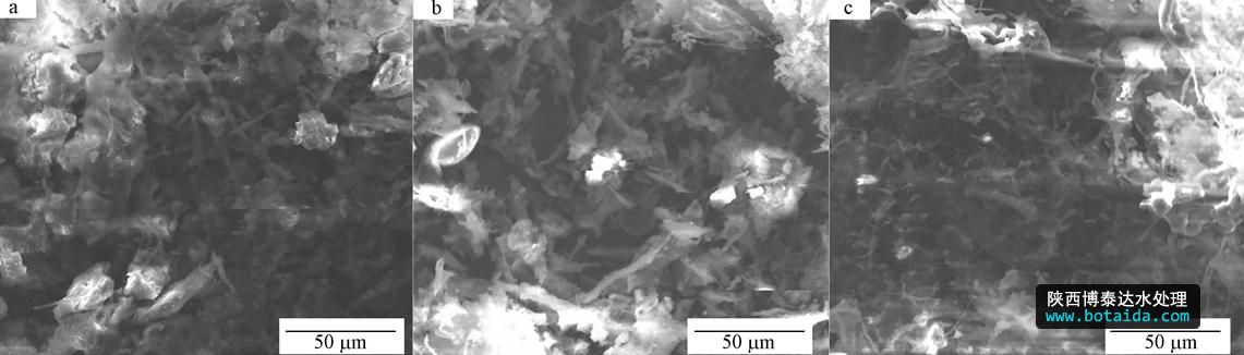 圖 5 污泥經(jīng)不同處理后的SEM圖 (a.原污泥;b.蛋白酶;c. SC+蛋白酶)