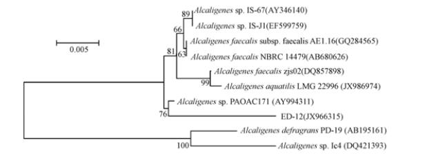 經(jīng)測序,獲得片段長度為1463 bp的部分16S rRNA基因序列,GenBank登錄號為JX966315. 在NCBI數(shù)據(jù)庫的比對結(jié)果表明,該菌株與Alicaligenes sp.的相似性達(dá)98%以上,推測其為Alicaligenes sp. 選擇序列相關(guān)性較高的76個(gè)16S rRNA序列,用Cluxtal X序列分析軟件分析其與ED-12的序列同源可靠性,選9個(gè)可信度較高的序列用MEGA 4.0軟件通過N-J法構(gòu)建系統(tǒng)發(fā)育樹,確定ED-12的進(jìn)化地位,結(jié)果如圖 1所示.