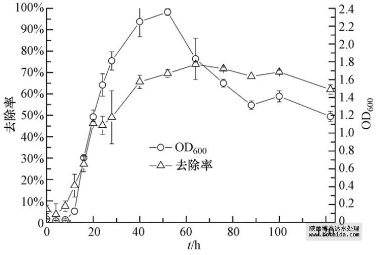 由此可知,聚磷菌ED-12菌株能夠在以NH4Cl、NaNO3、NaNO2、(NH4)2SO4、蛋白胨和NH4NO3為唯一氮源的培養(yǎng)基中生長.根據(jù)微生物生長量、生長周期及對PO3-4-P的去除率,NH4Cl是菌株ED-12生長及發(fā)揮除磷能力的最佳氮源.