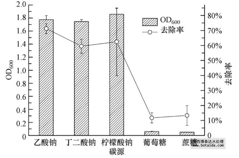 以乙酸鈉、丁二酸鈉、檸檬酸鈉、葡萄糖和蔗糖為碳源,菌株ED-12的生長及除磷能力結(jié)果如圖 3所示,菌株ED-12在以葡萄糖和蔗糖為碳源時(shí)基本不生長,對PO3-4-P的去除率低于15%. 而菌株在以乙酸鈉、丁二酸鈉、檸檬酸鈉為碳源時(shí)長勢較好,且對PO3-4-P的去除率都在50%以上. 其中,以乙酸鈉為碳源時(shí),菌株ED-12生長最旺盛,對PO3-4-P的去除率達(dá)到了70%以上. 對比5種碳源結(jié)構(gòu)與分子量,相對而言,在分子結(jié)構(gòu)簡單、分子量低的情況下,聚磷菌的生長較好,且能達(dá)到一個(gè)較高的除磷率,這與前述觀點(diǎn)相符. 此外,聚磷菌對不同碳源的利用效果可能還與其本身對碳源的親和性或其他特性有關(guān).