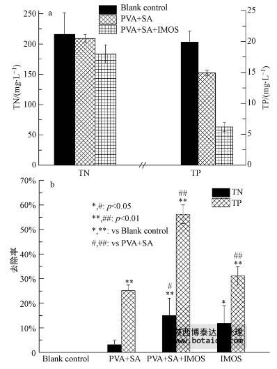 以不添加菌球的組別為空白對照(Blank control),以不添加微生物的固定化小球組為陽性對照(PVA+SA),按5%(m/V,g · L-1)投加小球. 24 h后取樣測定水樣的TN和TP濃度,計(jì)算脫氮除磷能力.
