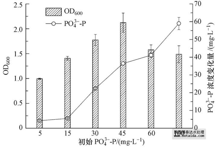 聚磷菌對磷的去除包括兩條途徑:生長利用和異染顆粒貯磷.根據(jù)聚磷菌分離篩選原理,過高濃度的PO3-4-P會抑制聚磷菌的生長與繁殖. 因此,考察不同起始濃度的PO3-4-P對聚磷菌生長的影響及相應(yīng)條件下聚磷菌對PO3-4-P的去除效果,對分析聚磷菌生長與聚磷過程的關(guān)系及指導(dǎo)聚磷菌在富營養(yǎng)化水體中的工程應(yīng)用有實(shí)際意義.