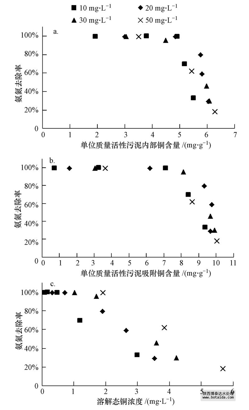 圖 6 不同形態(tài)的銅和氨氮去除率的相關性(a.活性污泥內部的銅;b.活性污泥吸附的銅;c.溶解態(tài)的銅)