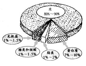 水在細(xì)胞中含量是最多的.在不同種類的生物體中,水的含量差別較大,一般來說,生物體中水的含量為60%~95%.例如,幼嫩植物體中水的含量約為70%,動物體中水的含量約為80%左右,水母的身體里水的含量竟約為97%.