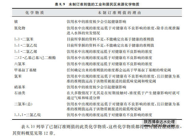 表8.9列舉了尚未制訂準(zhǔn)則值的來源于工業(yè)和居民區(qū)活動(dòng)的化學(xué)物質(zhì),并在表中說明 了理由,其資料概覽見第12章。