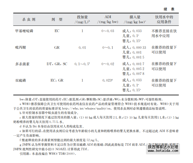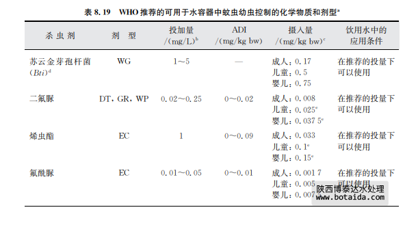 WHOPES對(duì)因公共衛(wèi)生目的使用的農(nóng)藥進(jìn)行了評(píng)價(jià)。目前,WHOPES已評(píng)估并列出的 可在容器中控制蚊蟲(chóng)幼卵的包括七種殺幼蟲(chóng)劑(二氟脲、烯蟲(chóng)酯、氟酰脲、甲基嘧啶磷、吡丙醚、 多殺菌素和雙硫磷)和一種細(xì)菌殺蟲(chóng)劑(蘇云金芽孢桿菌,犅?tīng)釥銧闋鞝鞝鯛鬆魻锠鯛驙闋顮鐮闋鍫顮鬆闋鬆闋鬆驙釥鍫鞝鍫顮鬆闋螅?br />         雖然沒(méi)必要為以控制攜菌體為目的的農(nóng)藥設(shè)定準(zhǔn)則值,但有必要就它們使用時(shí)的安全 性提供足夠的信息。用于飲用水?dāng)y菌體控制的農(nóng)藥劑型必須嚴(yán)格遵守商品標(biāo)簽建議,并且 包括從材料到配制最終產(chǎn)品的配方組分,一定要使用國(guó)家主管部門(mén)批準(zhǔn)可用于此用途的產(chǎn) 品。為制定準(zhǔn)則評(píng)估控制攜菌體的農(nóng)藥時(shí),評(píng)價(jià)報(bào)告主要由犃犇犐與潛在暴露風(fēng)險(xiǎn)的比較組 成。不過(guò),超過(guò)犃犇犐的攝入不一定意味著會(huì)對(duì)健康產(chǎn)生負(fù)面影響。由于攜菌體傳播的疾病 有很高的發(fā)病率和死亡率,控制病原昆蟲(chóng)與飲用水?dāng)z入農(nóng)藥量之間必須找到一個(gè)合適的平 衡。需要強(qiáng)調(diào)的是,應(yīng)努力使總攝入量和任何殺幼蟲(chóng)劑的濃度都低于 WHOPES的推薦水 平,并且在具有足夠的效力條件下盡可能低。