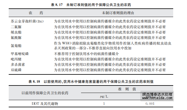 表8.17列舉了尚未制訂準(zhǔn)則值用于保障公共衛(wèi)生的農(nóng)藥。二氯二苯基三氯乙烷 (DDT)在過(guò)去常被使用以保障公共衛(wèi)生,現(xiàn)在在某些地區(qū)將DDT再次引入以控制攜帶瘧疾 的蚊蟲(chóng)(但不應(yīng)用在飲用水領(lǐng)域)。表8.18列出了DDT的準(zhǔn)則值。表8.19列舉了各種殺 蟲(chóng)劑產(chǎn)品的劑型,投量比和相應(yīng)的攝入量。 準(zhǔn)則中所涉及的殺幼蟲(chóng)劑的資料概覽詳見(jiàn)第12章