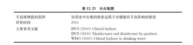 水合氯醛或者三氯乙醛是當(dāng)水中含有有機前體物(如富里酸和腐殖酸)時,生成的氯 化消毒副產(chǎn)物(見表12.23)。有研究發(fā)現(xiàn)它在飲用水中的濃度可高達(dá)100μg/L,但是通 常濃度低于10μg/L。一般地表水中的濃度高于地下水,其濃度在水的輸送過程中可能會 增高。