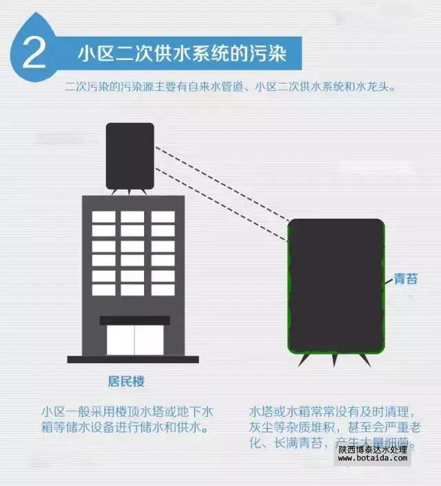 小區(qū)一般采用樓頂水塔或地下水箱等儲水設備進行儲水和供水。而水塔或水箱常常沒有及時清理,灰塵等雜質(zhì)堆積。有的儲水設備甚至會嚴重老化、長滿青苔,產(chǎn)生大量細菌滋生。
