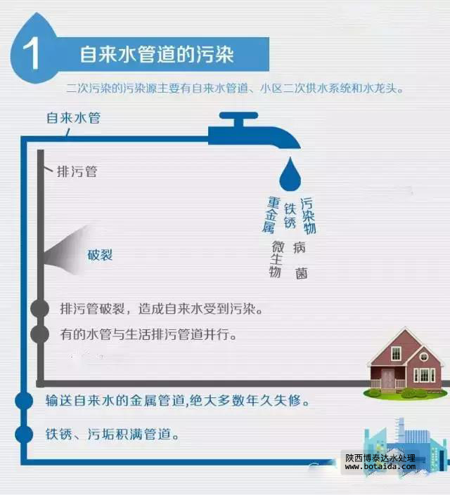 顧名思義,二次污染是指水源經(jīng)自來水廠凈化處理后,在輸送到各家各戶的過程中產(chǎn)生的污染。主要是一些水管老化出現(xiàn)的鐵銹、泥沙、細菌、病毒等雜質(zhì)和自來水廠氯制劑消毒后的副產(chǎn)物。二次污染的污染源主要有自來水管道、小區(qū)二次供水系統(tǒng)和水龍頭。