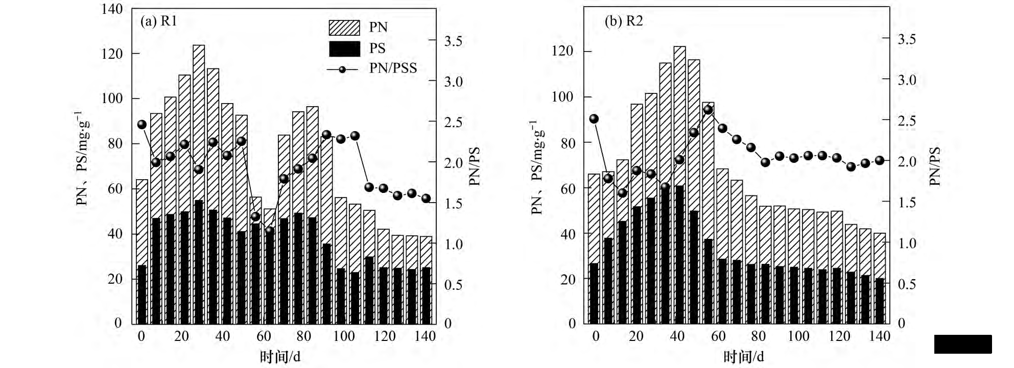胞外聚合物( EPS) 主要由蛋白質(zhì)( PN) 和多糖 ( PS) 組成,在污泥顆?;^(guò)程中具有重要作 用. 如圖4 所示,PN、PS 在顆粒污泥啟動(dòng)階段 ( 0 ~ 25 d 和 0 ~ 42 d) 整體呈上升趨勢(shì),R1、R2 內(nèi)的 PN 含量( 以 MLSS 計(jì)) 分別由初始的 64. 12mg·g - 1 、65. 98 mg·g - 1 增 加 到 最 大 值 123. 65mg·g - 1 、122. 19 mg·g - 1 ,PS 含量分別由初始的26. 08 mg·g - 1 、26. 59 mg·g - 1 增加到最大值 64. 89mg·g - 1 、62. 13 mg·g - 1 . PS 越高,污泥表面親水性越強(qiáng),PN 增加,污泥疏水性增強(qiáng),細(xì)菌之間的黏附性能也隨之增加,有利于顆粒污泥的形成. R1 中微生物可利用的有機(jī)負(fù)荷較高,刺激微生物產(chǎn)生更多的EPS,故顆粒形成時(shí)間較短. 在實(shí)驗(yàn)進(jìn)行的第 57 ~ 78 d,由于室內(nèi)溫度較低( 5 ~ 16℃ ) ,R1 中PN 含量減少至 51. 15 mg·g - 1 ,細(xì)胞表面的疏水性減弱,不利于微生物相互黏附,顆粒解體,而生活污水中含有一定的蛋白質(zhì),與顆粒污泥接觸時(shí)可被絮凝吸附,故 R2 中PN 含量受溫度影響較小.