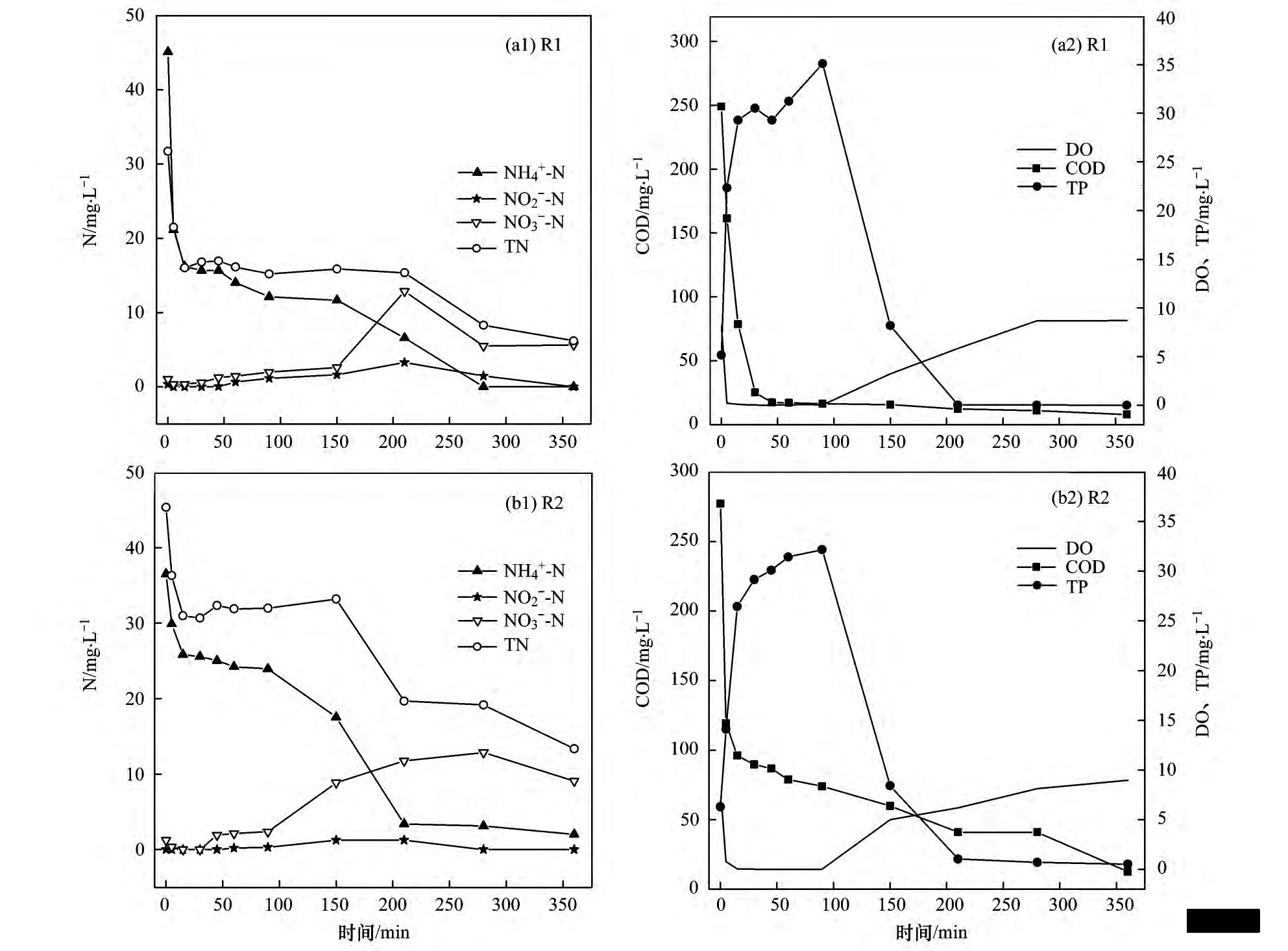 圖 6 為 R1、R2 在第 128 d 的一個(gè)典型周期內(nèi)NH + -N、NO - -N、NO - -N、TN、COD、TP、溶解氧4 2 3( DO) 的濃度變化. 厭氧階段,R1、R2 反應(yīng)器內(nèi)的DO 濃度在 0. 02 mg·L - 1 以下,好氧階段,R1、R2中 DO 緩慢增加,最終穩(wěn)定在 8 mg·L - 1 左右,反應(yīng)器內(nèi)具有良好的 A/ O 運(yùn)行環(huán)境. R1 中 COD 濃度在厭氧階段下降較快,在前 30 min 已經(jīng)基本消耗,COD 由 250 mg·L - 1 降至 25. 12 mg·L - 1 . R2 反應(yīng)器進(jìn)水為生活污水,在厭氧階段,由于有機(jī)物成分復(fù)雜,微生物可快速利用的有機(jī)碳源較少,所以降解速度較慢, COD 由 275. 19 mg·L - 1 降至 90. 44mg·L - 1 ; 在好氧階段,反硝化作用消耗有機(jī)碳源,COD 濃度逐漸降低至 24. 58 mg·L - 1 ,COD 得到去除. 在厭氧末期,R1 釋磷較多,反應(yīng)器內(nèi)的 TP 濃度為 35. 09 mg·L - 1 ,而 R2 反應(yīng)器內(nèi)的 TP 濃度為32. 18 mg·L - 1 . 導(dǎo)致釋磷量不同的主要原因?yàn)樯钗鬯泻新偕锝到馕镔|(zhì)和溶解性惰性物質(zhì)等不利于聚磷菌利用的有機(jī)物,在厭氧階段不能夠完全降解,降低了釋磷量. 在周期實(shí)驗(yàn)出水中,R1、R2 出水均未檢測(cè)到NH + -N、NO - -N,出水NO - -N濃度分別為 5. 65 mg·L - 1 、9. 67 mg·L - 1 ,產(chǎn)生這種現(xiàn)象的原因?yàn)?,穩(wěn)定運(yùn)行時(shí),R1 中顆粒污泥粒徑較R2 大,由于好氧顆粒污泥內(nèi)部存在一個(gè)“缺氧區(qū)”,粒徑越大,顆粒污泥內(nèi)部的缺氧區(qū)越大,這為反硝化菌提供了良好的生存環(huán)境,提高了反硝化能力,因此 R1 反應(yīng)器內(nèi)NO - -N的出水效果更好.