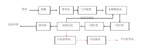 水處理系統(tǒng)由調(diào)節(jié)池、缺氧池、好氧池(接觸氧化池)、二沉池組成。來自生產(chǎn)車間的污水自流入調(diào)節(jié)池,調(diào)節(jié)池入口設(shè)機械格柵,以攔截大顆粒狀和纖維狀雜質(zhì),在調(diào)節(jié)池中污水充分地混合,調(diào)節(jié)水量并初步降解有機物,然后通過污水泵將污水輸入氣浮池,去除油污,懸浮物進入缺氧池,在缺氧池中回流混合液與原污水充分混合,通過兼氧微生物的作用,將亞硝酸氮和硝酸氮轉(zhuǎn)化為氮氣,完成反硝化脫氮,缺氧池出水自流入接觸氧化池。接觸氧化池是一種以生物膜法為主,兼有活性污泥法的生物處理裝置,通過鼓風機提供氧源,使污水中的有機物與池內(nèi)生物膜充分接觸,經(jīng)微生物吸附、降解作用,使水質(zhì)得到凈化。二沉池出水進入混凝沉淀,進一步去除污染物,使出水達標排放。