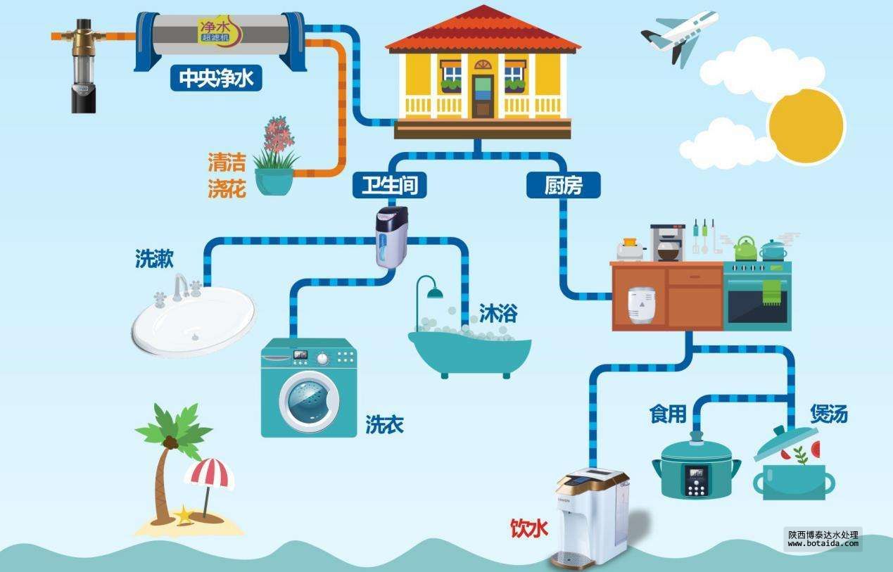 由中央凈水器處理后的凈水,分管流向廚房、衛(wèi)生間、客廳等各個(gè)房間。